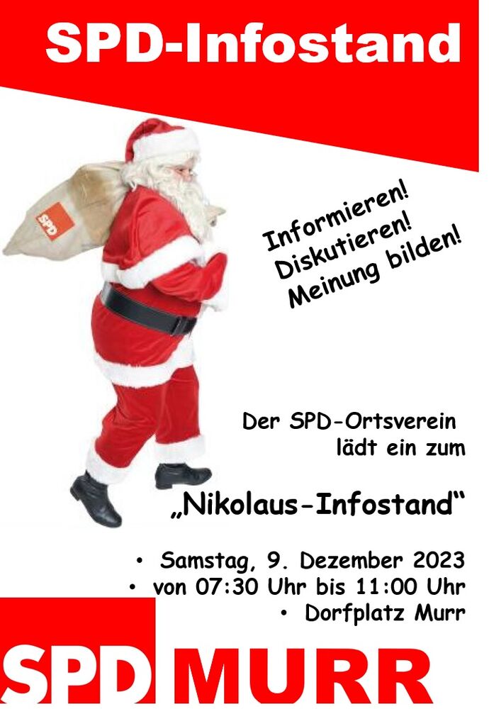 Am Samstag, 09.12.2023, ist der SPD-Ortsverein wieder von 07:30 Uhr bis 11:00 Uhr mit seinem traditionellen Nikolaus-Infostand auf dem Murrer Dorfplatz vertreten. „Informieren – Diskutieren - Meinung äußern“ ist wieder das Motto. Alle Standbesucher erhalten eine kleine Aufmerksamkeit.